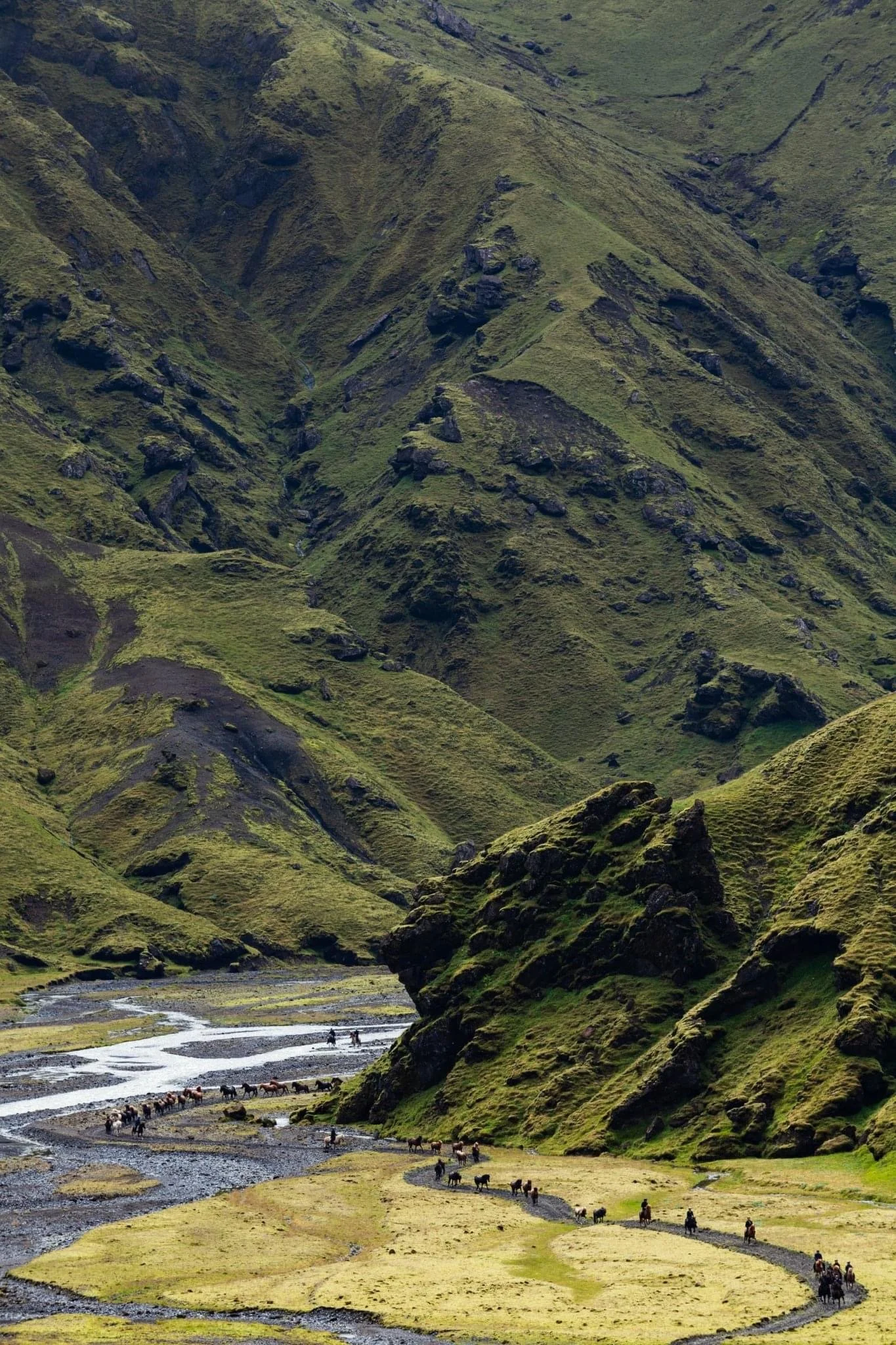 In the morning, we take a single horse and leave the herd behind for a peaceful ride down through Þverabotnar, a hidden gem of Icelandic wilderness. This remote valley is a peaceful haven, surrounded by towering mountains, moss-covered lava fields, and crystal-clear streams. As we ride slowly through this untouched landscape, you can breathe in the fresh mountain air, listen to the gentle sounds of the rivers, and truly connect with nature.