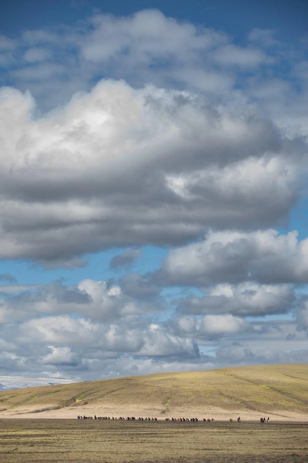 After fully experiencing the magic of Þverabotnar, we return to Emstrur to gather the herd and continue our journey over the highlands toward Fell. Along the way, we traverse gentle valleys, cross sparkling rivers, and make our way over the iconic Einhyrning mountain. We stop for a short break in Bólstaður before arriving at Fell, where a cozy mountain hut awaits, with the horses comfortably settled just outside.